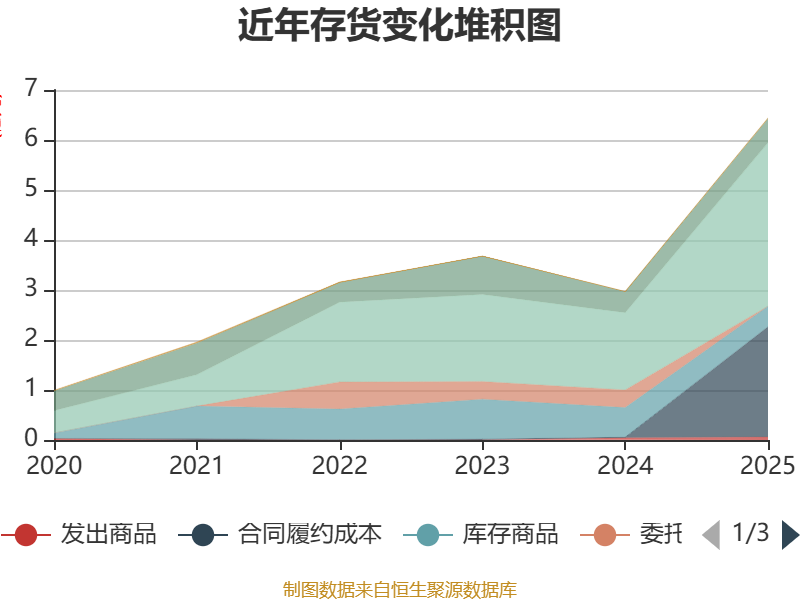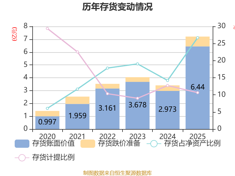从存货变动来看,截至2025年末,公司存货账面价值为6.44亿元,占净资产的26.68%,较上年末增加3.47亿元。其中,存货跌价准备为7672.47万元,计提比例为10.65%。