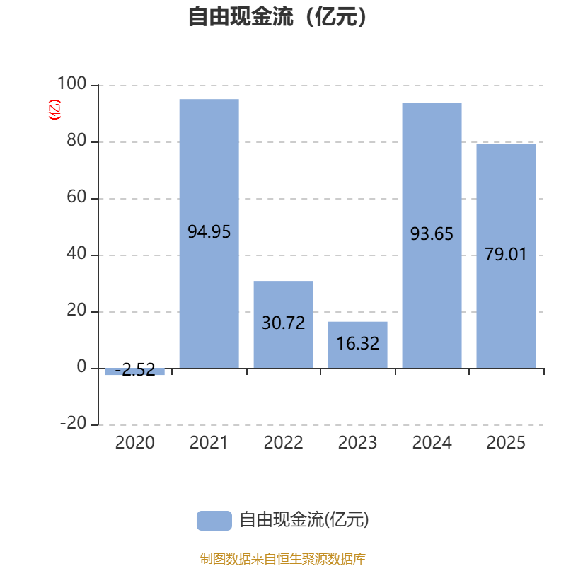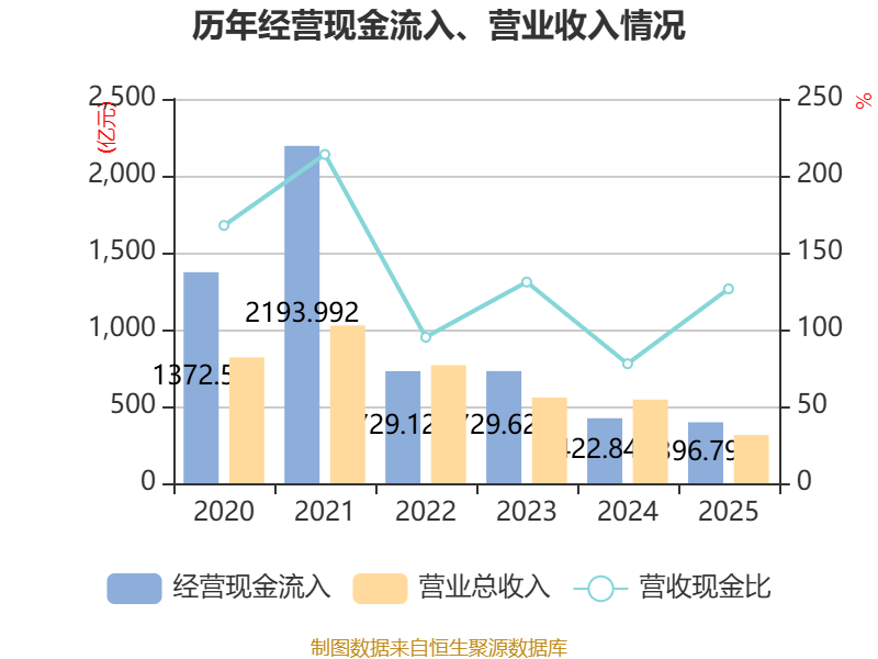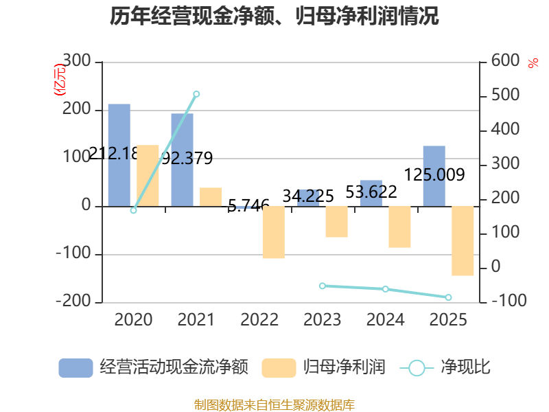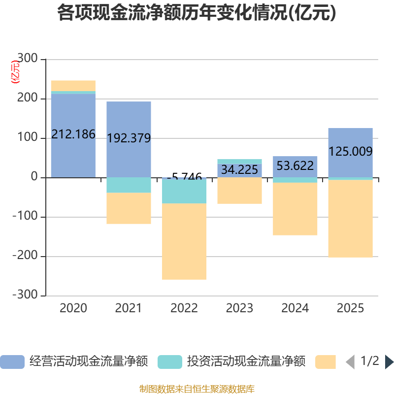 截至2025年,公司经营活动现金流净额为125.01亿元,同比增长133.13%;筹资活动现金流净额-196.54亿元,同比减少63.03亿元;投资活动现金流净额-7.01亿元,上年同期为-13.62亿元。