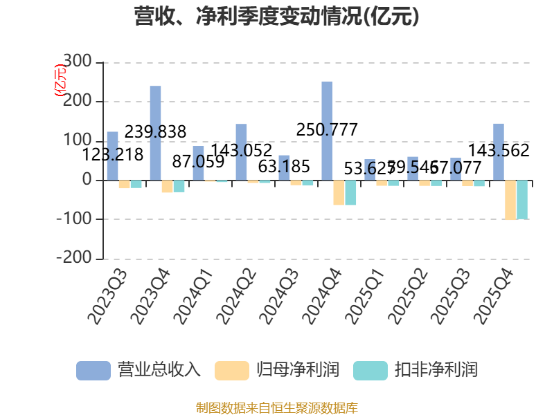 中证智能财讯华侨城A(000069)3月31日披露2025年年度报告。2025年,公司实现营业总收入313.81亿元,同比下降42.32%;归母净利润亏损144.96亿元,上年同期亏损86.62亿元;扣非净利润亏损143.87亿元,上年同期亏损88.3亿元;经营活动产生的现金流量净额为125.01亿元,同比增长133.13%;报告期内,华侨城A基本每股收益为-1.84元,加权平均净资产收益率为-34.44%。