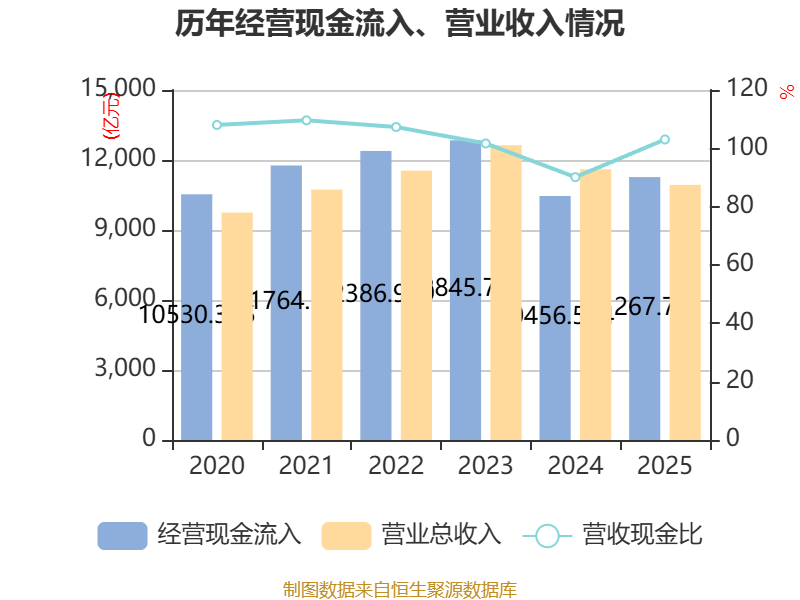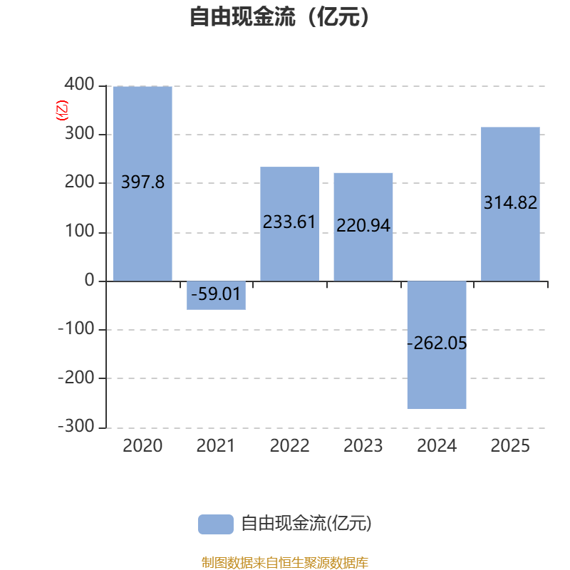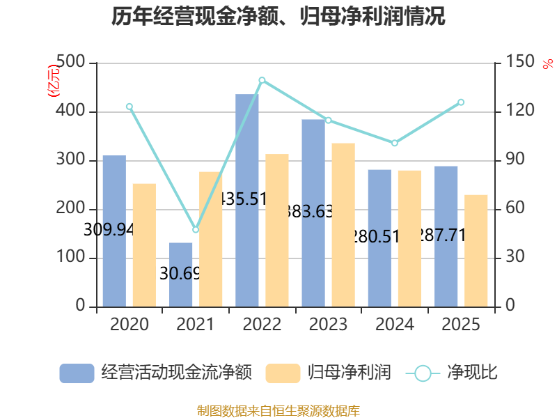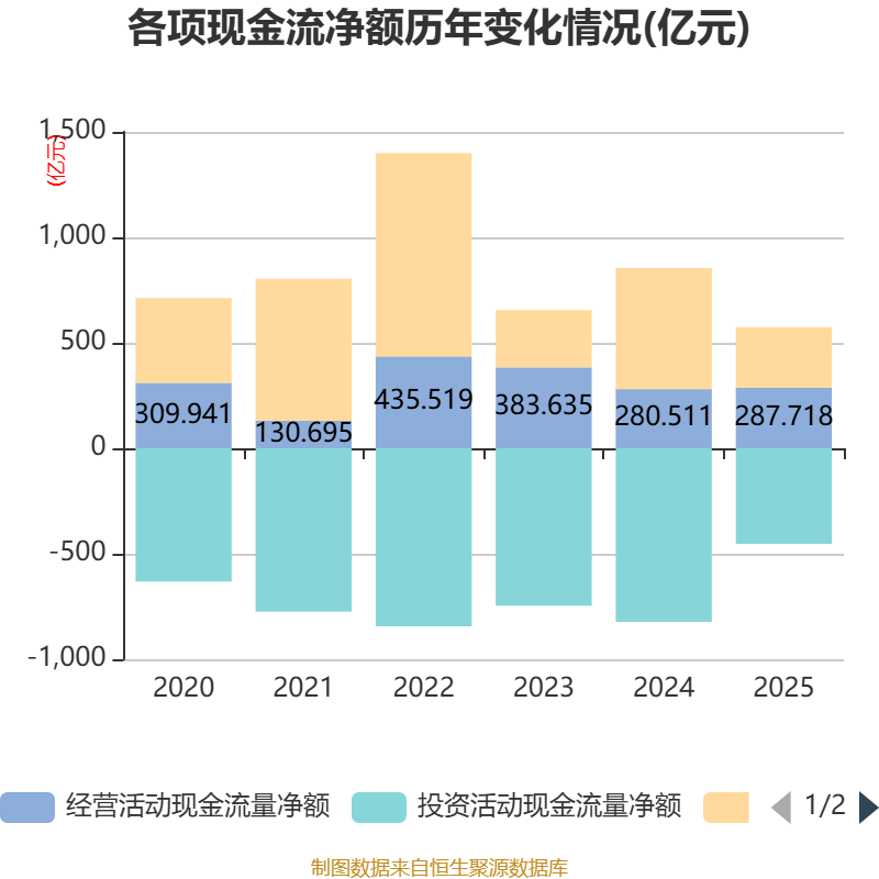 截至2025年,公司经营活动现金流净额为287.72亿元,同比增长2.57%;筹资活动现金流净额286.82亿元,同比减少287.13亿元;投资活动现金流净额-452.65亿元,上年同期为-822.89亿元。