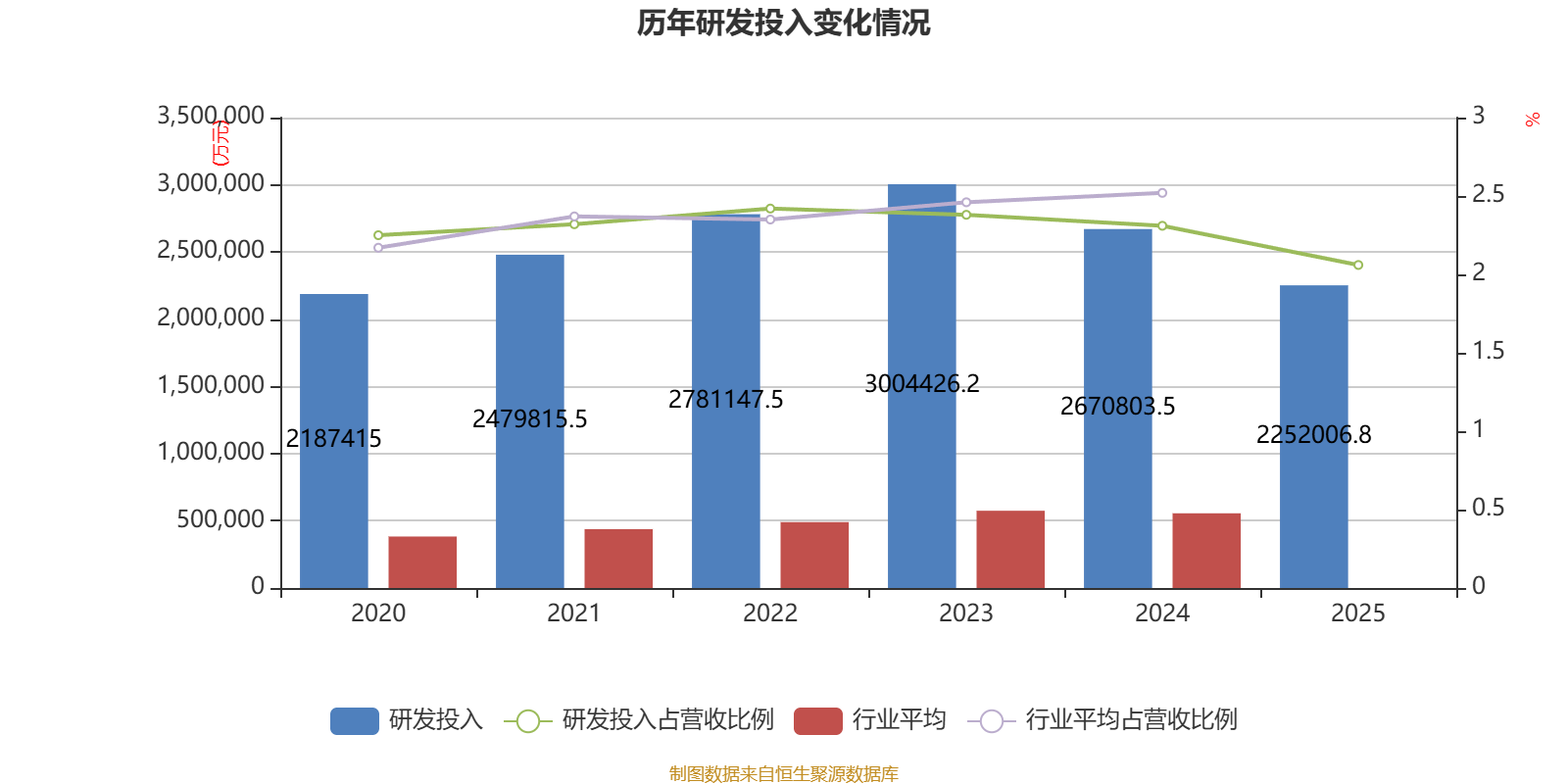 2025年全年,公司研发投入金额为225.2亿元,同比下降15.68%;研发投入占营业收入比例为2.06%,相比上年同期下降0.25个百分点。此外,公司全年研发投入资本化率为0.34%。