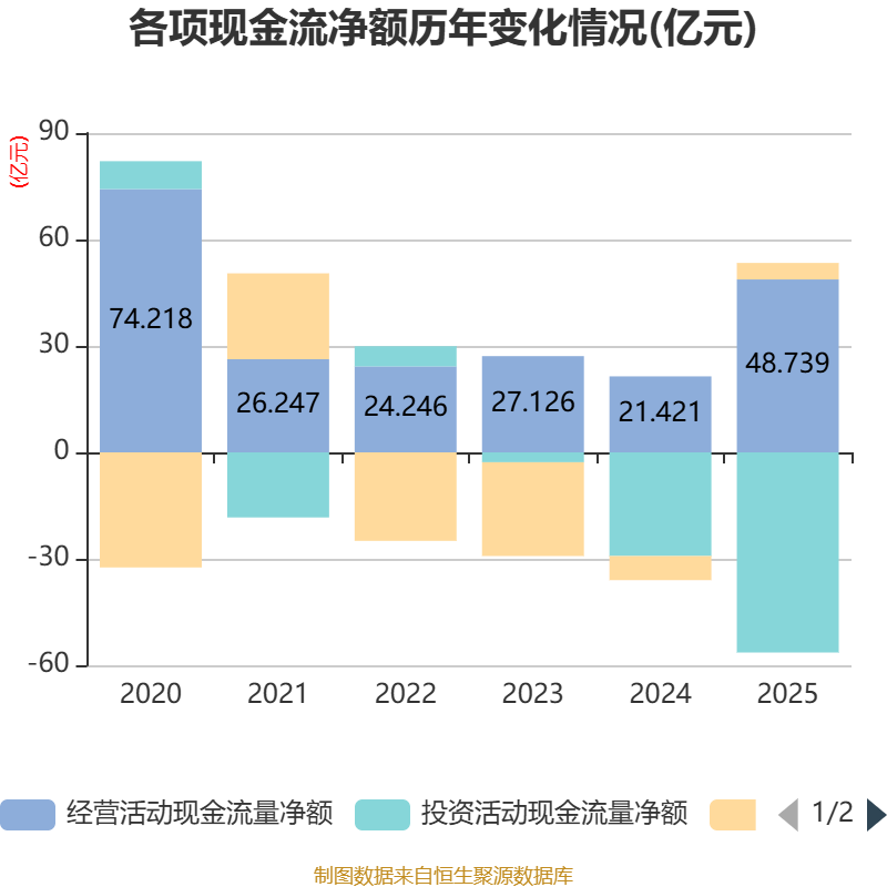 截至2025年,公司经营活动现金流净额为48.74亿元,同比增长127.53%;筹资活动现金流净额4.65亿元,同比增加11.45亿元;投资活动现金流净额-56.41亿元,上年同期为-29.22亿元。