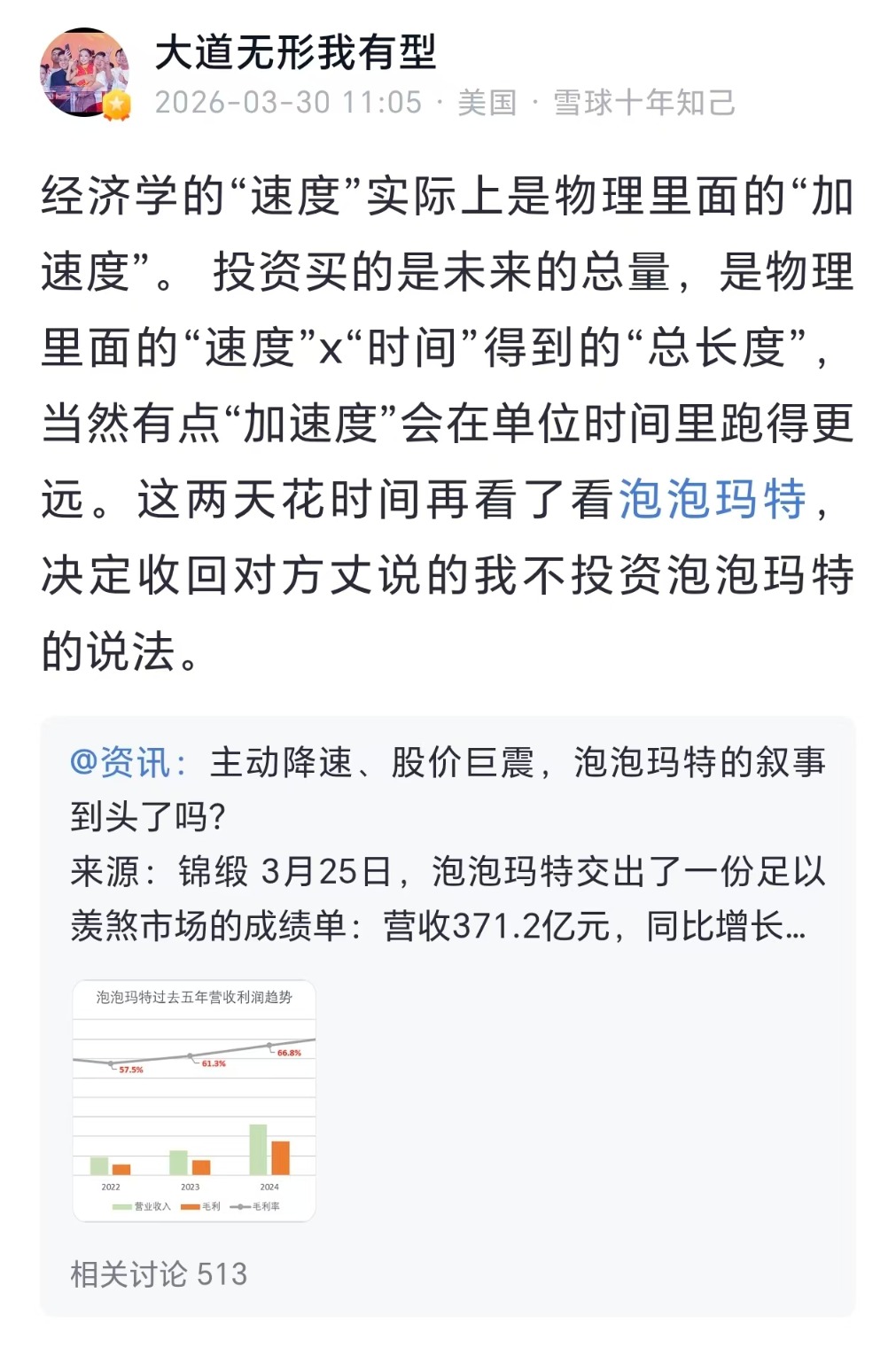 3月30日,段永平在社交平台转发了一篇点评泡泡玛特近期股价剧震的文章称,经济学的“速度”实际上是物理里面的“加速度”。投资买的是未来的总量,是物理里面的“速度”x“时间”得到的“总长度”,当然有点“加速度”会在单位时间里跑得更远。他表示,这两天花时间再看了看泡泡玛特,决定收回不投资泡泡玛特的说法。