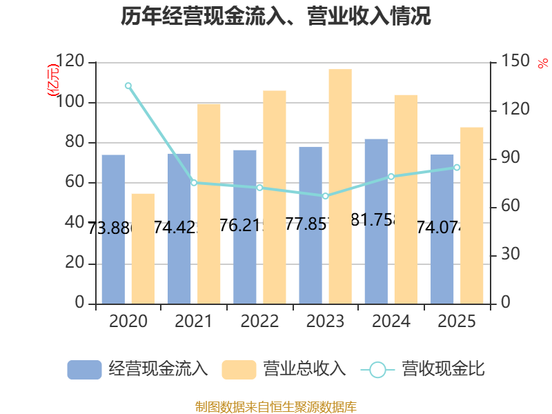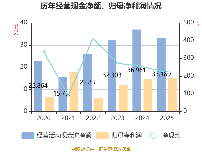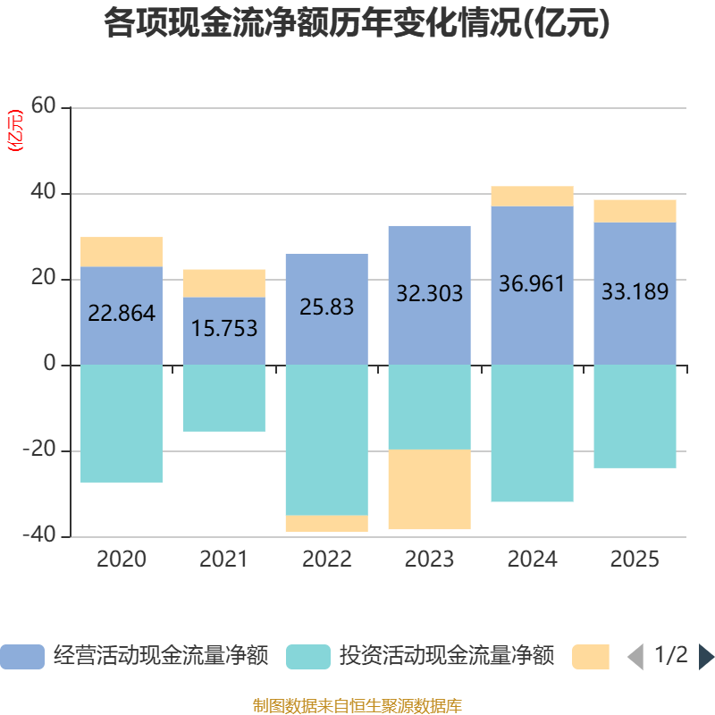 截至2025年,公司经营活动现金流净额为33.19亿元,同比下降10.2%;筹资活动现金流净额5.21亿元,同比增加5673.53万元;投资活动现金流净额-24.14亿元,上年同期为-31.96亿元。