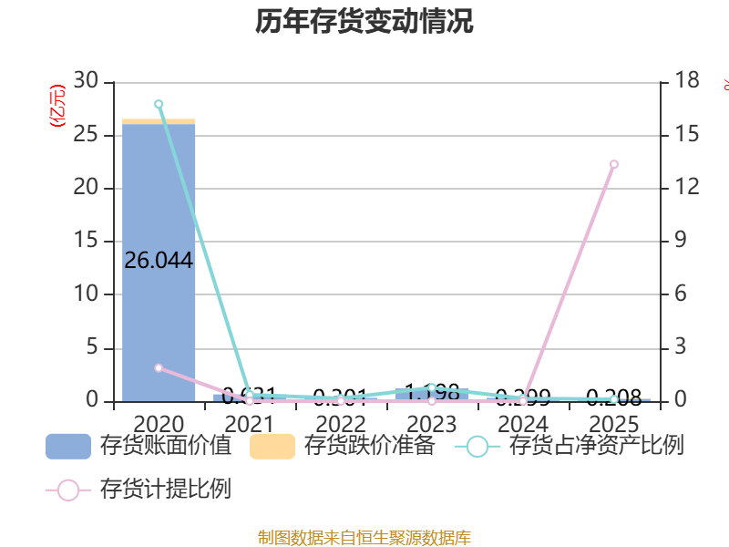从存货变动来看,截至2025年末,公司存货账面价值为2077.8万元,占净资产的0.1%,较上年末减少908.93万元。其中,存货跌价准备为320.53万元,计提比例为13.36%。