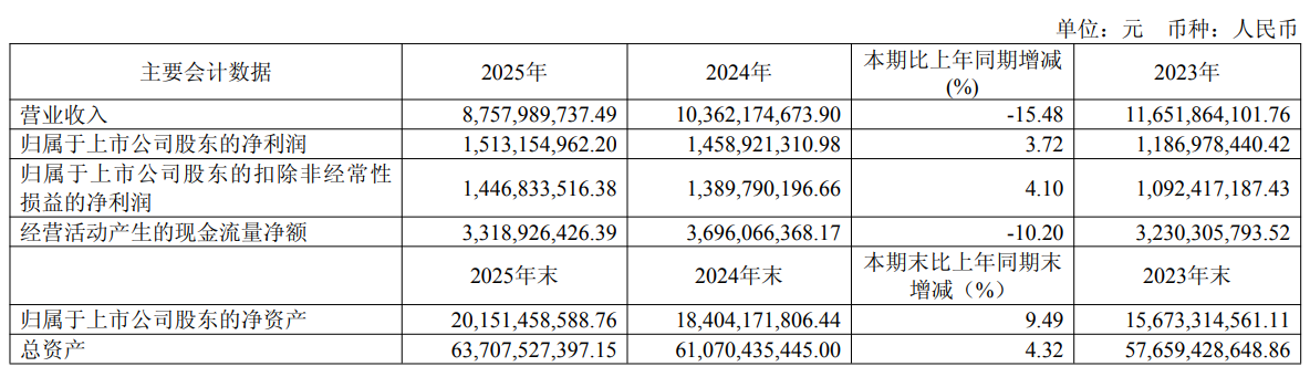 资产重大变化方面,截至2025年末,公司货币资金较上年末增加48.82%,占公司总资产比重上升2.06个百分点;无形资产较上年末增加2.26%,占公司总资产比重下降1.68个百分点;其他非流动资产较上年末减少12.25%,占公司总资产比重下降0.39个百分点;应收票据及应收账款较上年末减少48.55%,占公司总资产比重下降0.19个百分点。