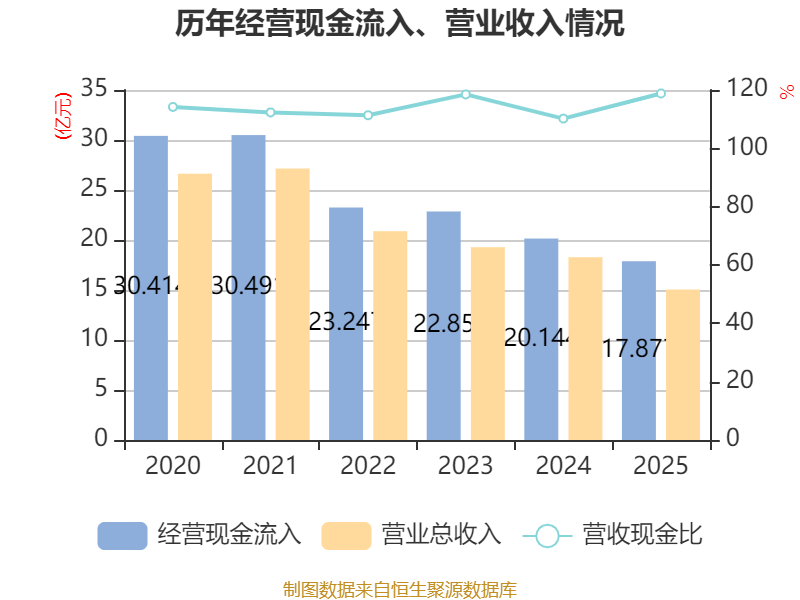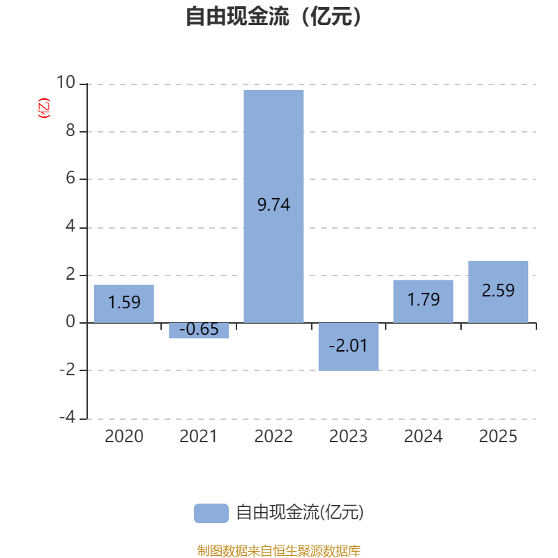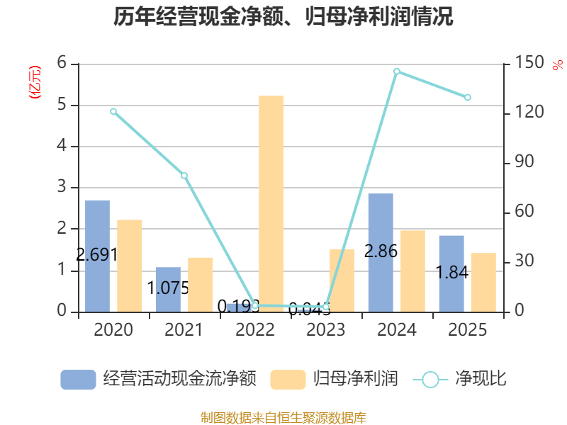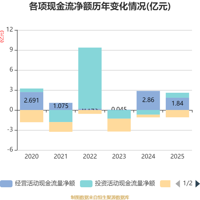 截至2025年,公司经营活动现金流净额为1.84亿元,同比下降35.65%;筹资活动现金流净额-1.1亿元,同比减少6869.81万元;投资活动现金流净额7491.35万元,上年同期为-6956.08万元。