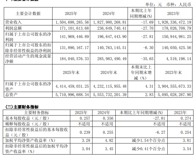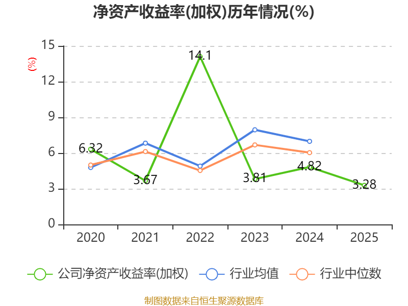 数据显示,2025年公司加权平均净资产收益率为3.28%,较上年同期下降1.54个百分点。公司2025年投入资本回报率为3.15%,较上年同期下降1.51个百分点。