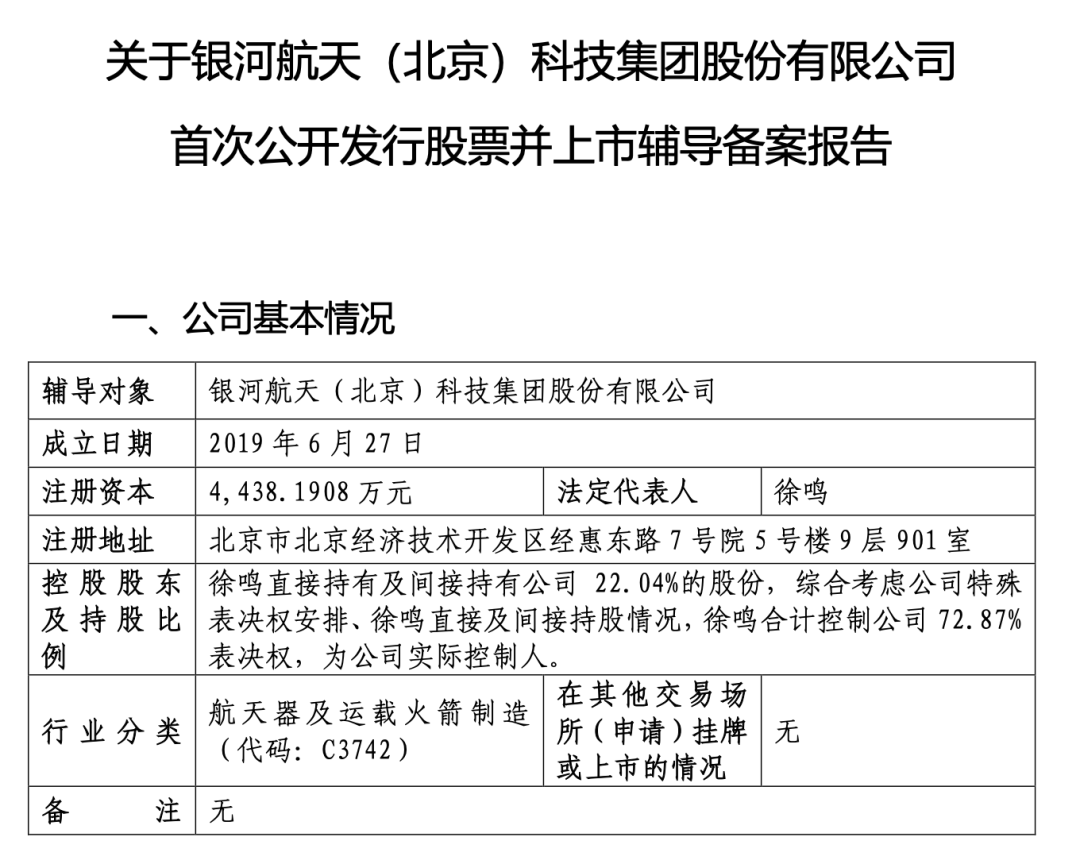 备案报告显示,徐鸣直接持有及间接持有公司22.04%的股份,综合考虑公司特殊表决权安排、徐鸣直接及间接持股情况,徐鸣合计控制公司72.87%表决权,为公司实际控制人。公司官网显示,徐鸣是银河航天创始人、董事长兼CEO,毕业于哈尔滨工业大学,是一名连续创业者。
