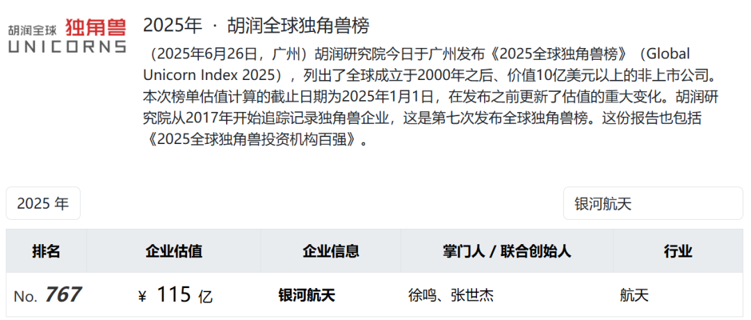 官网显示,银河航天是一家卫星互联网解决方案提供商和卫星制造商,致力于通信载荷、核心单机、卫星平台的自主研发与低成本量产。此前,银河航天以115亿元的估值入选胡润研究院发布的《2025全球独角兽榜》。