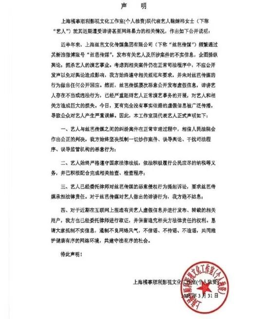 针对实名举报及舆论争议,鞠婧祎方于3月31日12时20分通过微博@鞠婧祎_Official 正式回应。声明称,艺人与丝芭传媒之间的纠纷案件正在正常审理过程中,相信人民法院会作出公正判决,坚决抵制一切炒作案件、误导舆论、干扰司法程序、恶意误导监管机构的行为。艺人始终严格遵守国家法律法规,依法积极履行纳税义务,并已积极配合完成相关抽查、检查程序。