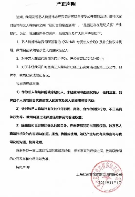 3月26日,丝芭传媒曾发布声明,否认与鞠婧祎方存在任何和解洽谈,称双方经纪合约纠纷仍在司法审理阶段,从未达成任何和解。