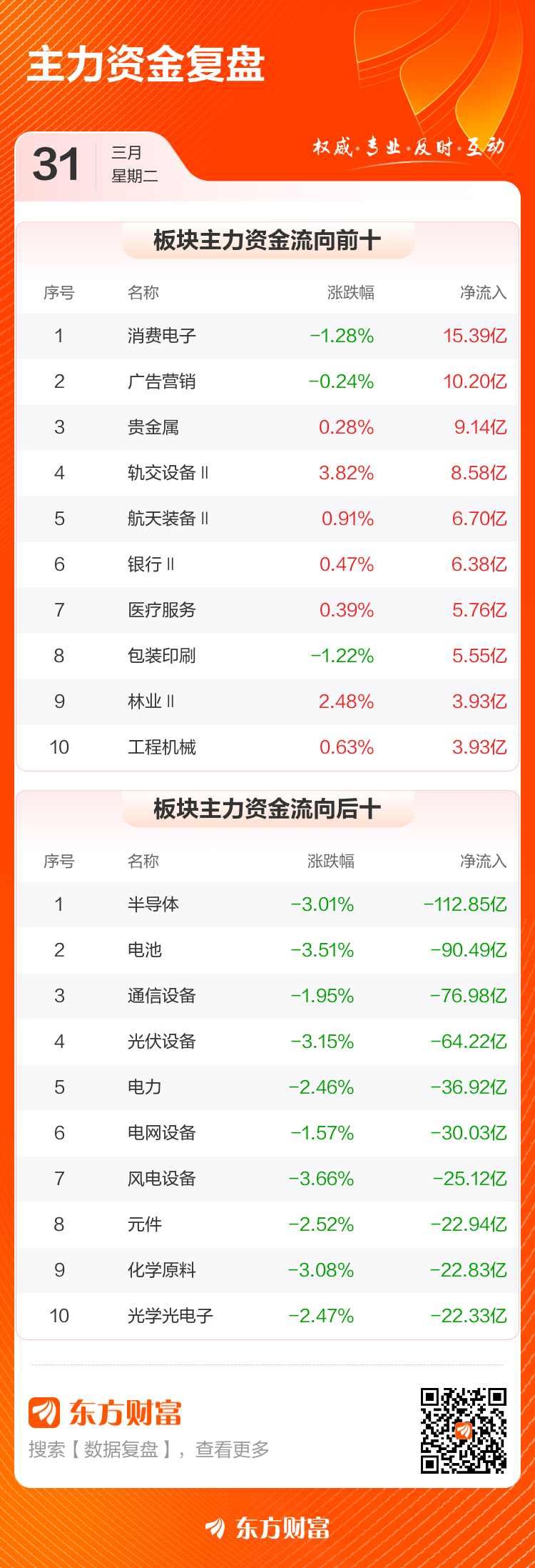 3月31日,沪指跌0.8%,深成指跌1.81%,创业板指跌2.7%。两市成交额1.99万亿,较上个交易日放量768亿。数据显示,今日大盘主力资金净流出835.29亿。消费电子、广告营销、贵金属等板块主力资金流入排名居前,其中消费电子净流入15.39亿元。