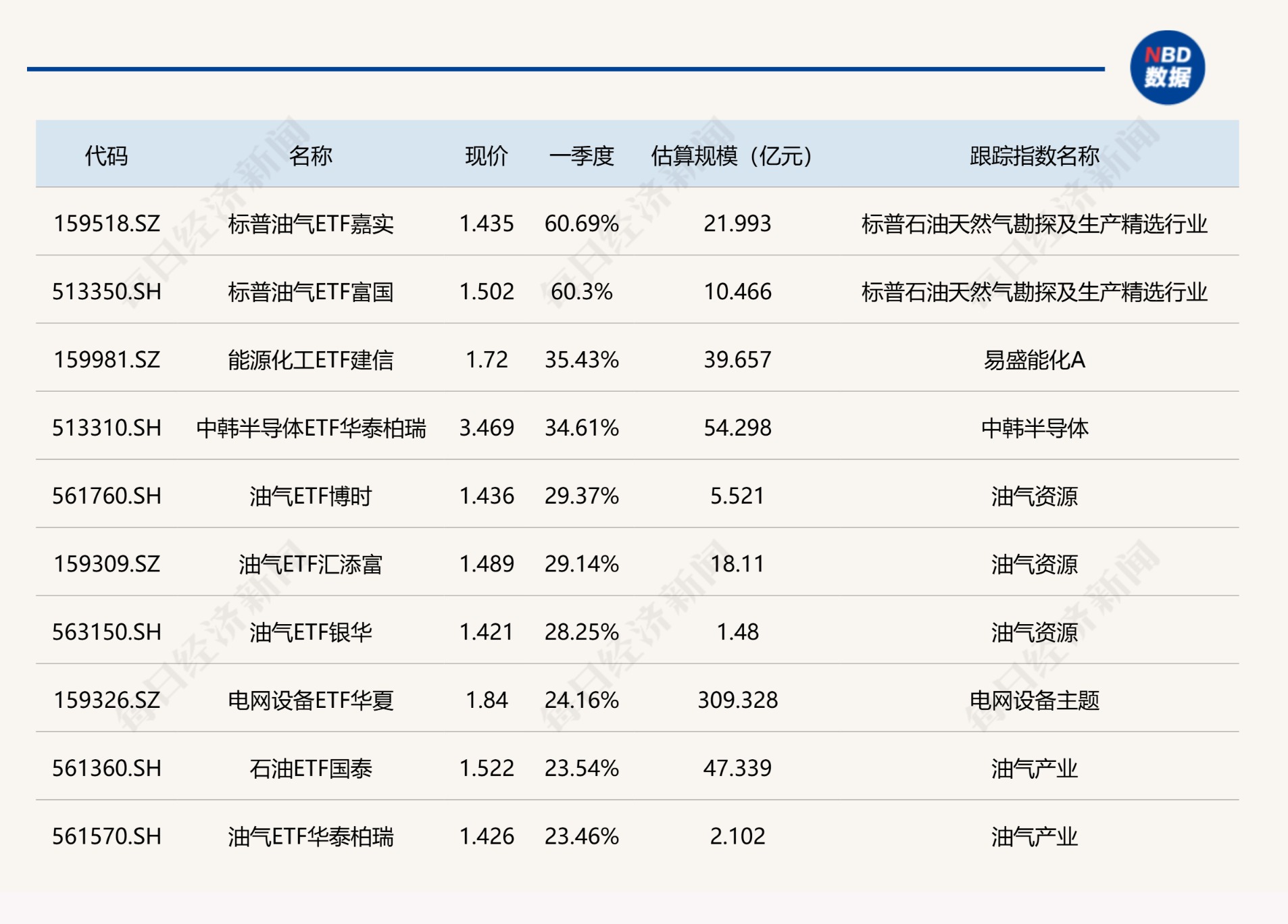 ETF方面,2只标普油气相关ETF一季度累计涨幅超60%,能源化工ETF建信、中韩半导体ETF华泰柏瑞紧随其后,累计涨幅超34%。