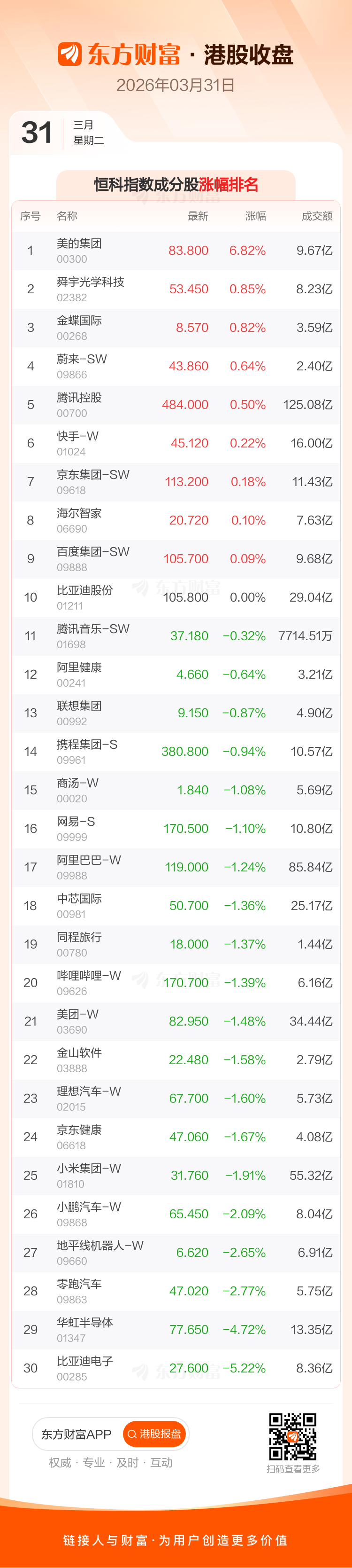 3月31日,恒生指数收报24788.14点,涨37.35点,涨幅0.15%;恒生科技指数收报4649.82点,跌40.26点,跌幅0.86%。恒生指数成分股中翰森制药、美的集团、华润万象生活涨幅居前,比亚迪电子、信义光能、中国石油股份跌幅靠前。恒生科技指数成分股中美的集团、舜宇光学科技、金蝶国际涨幅居前,比亚迪电子、华虹半导体、零跑汽车跌幅靠前。