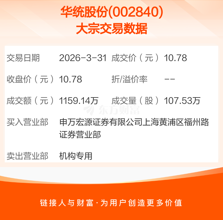 2026年3月31日,华统股份发生1笔大宗交易,共成交107.53万股,成交金额1159.14万元,占其流通市值比例为0.13%。