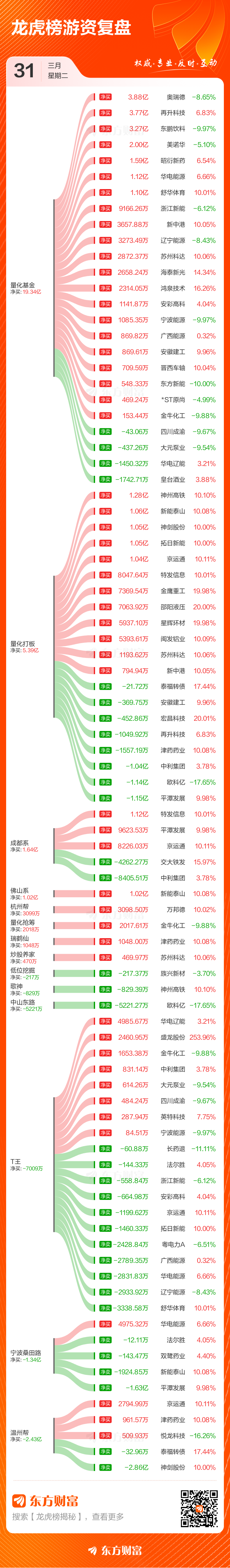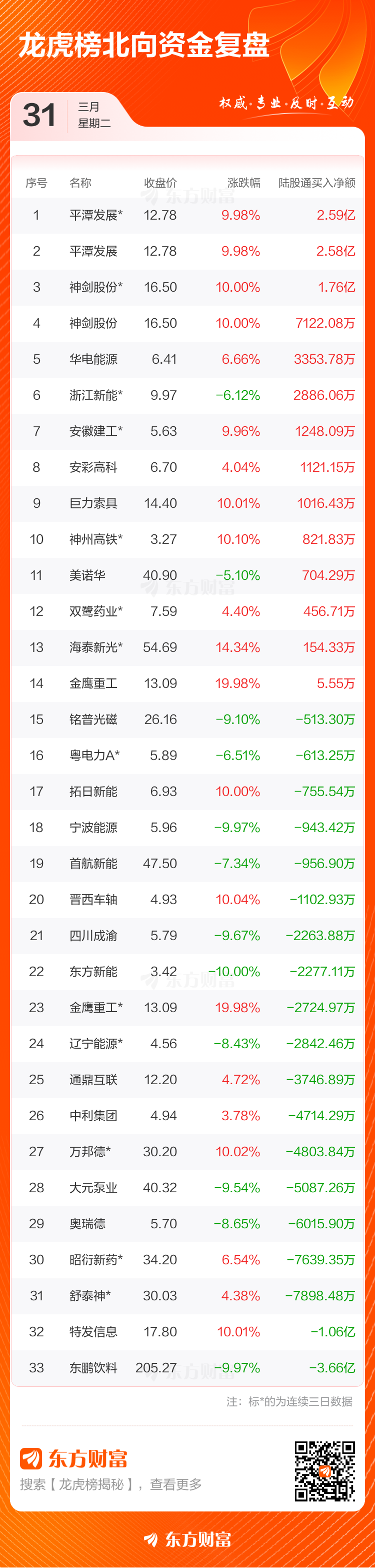 3月31日共有66只个股(含2只可转债)上榜龙虎榜,总上榜成交额219.74亿元。上榜个股中净买入额最高的是平潭发展,三天累计净买入金额为7.99亿元。