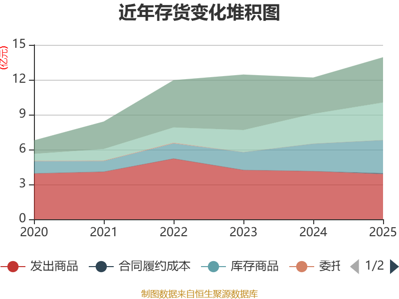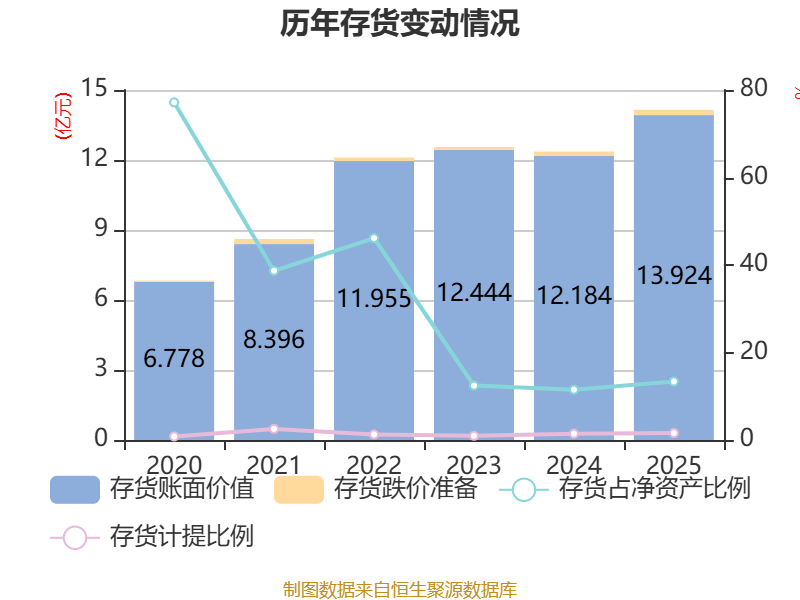 从存货变动来看,截至2025年末,公司存货账面价值为13.92亿元,占净资产的13.37%,较上年末增加1.74亿元。其中,存货跌价准备为2246.19万元,计提比例为1.59%。