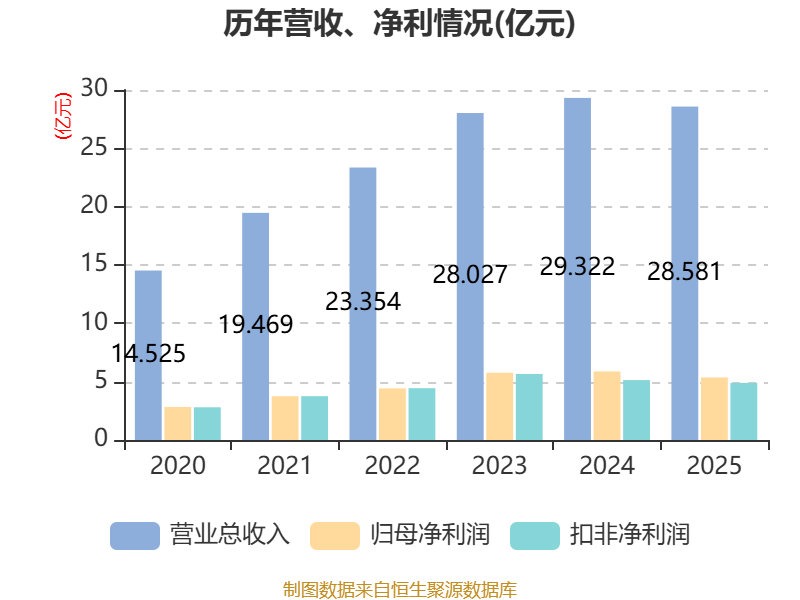 中证智能财讯航材股份(688563)4月1日披露2025年年度报告。2025年,公司实现营业总收入28.58亿元,同比下降2.53%;归母净利润5.36亿元,同比下降8.75%;扣非净利润4.89亿元,同比下降4.82%;经营活动产生的现金流量净额为4.75亿元,同比增长295.81%;报告期内,航材股份基本每股收益为1.19元,加权平均净资产收益率为4.99%。公司2025年度分配预案为:拟向全体股东每10股派现2.1528元(含税)。