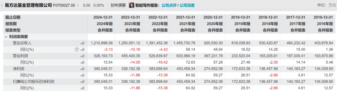 尽管行业地位依然稳固,但一个反常的现象在于,易方达基金过往很少出现“增收不增利”的情况。Wind数据显示,过往10年来,公司仅在2018年出现过“增收不增利”。在2024年,公司甚至在营收同比下滑的同时,净利润逆势保持了13.33%的增长。
