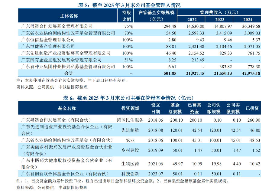 基金管理板块,截至2025年3月末,公司在管母基金23支,总认缴规模约848.71亿元,总实缴规模约378.52亿元,其中公司以自有资金投入约130.31亿元;同期末,在管子基金28支,总认缴规模430.18亿元,总实缴规模169.04亿元,其中公司实缴约25.52亿元。