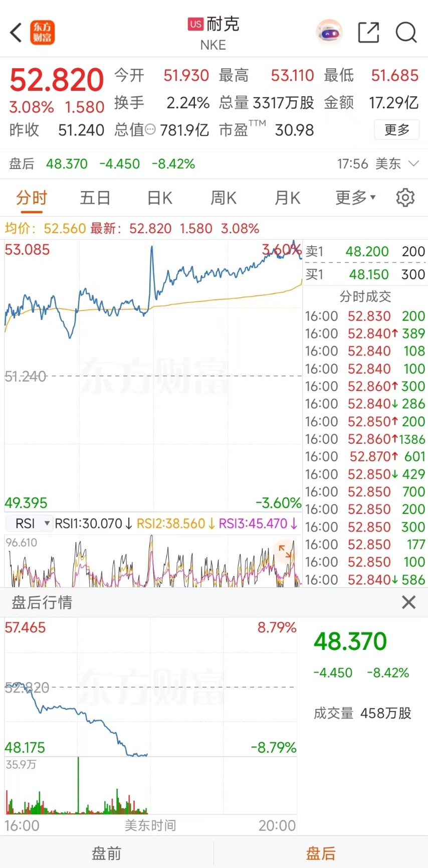 财报方面,耐克预计第四季度营收下降2%-4%,盘后股价跌超8%。