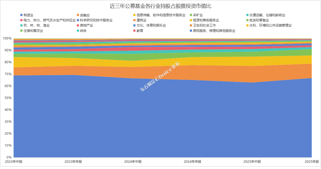 持股市值行业配置上,制造业仍为第一大重仓行业,占股票投资市值比55.11%;金融业排名第二,占比9.97%,信息传输、软件和信息技术服务业位列第三,占比5.70%。