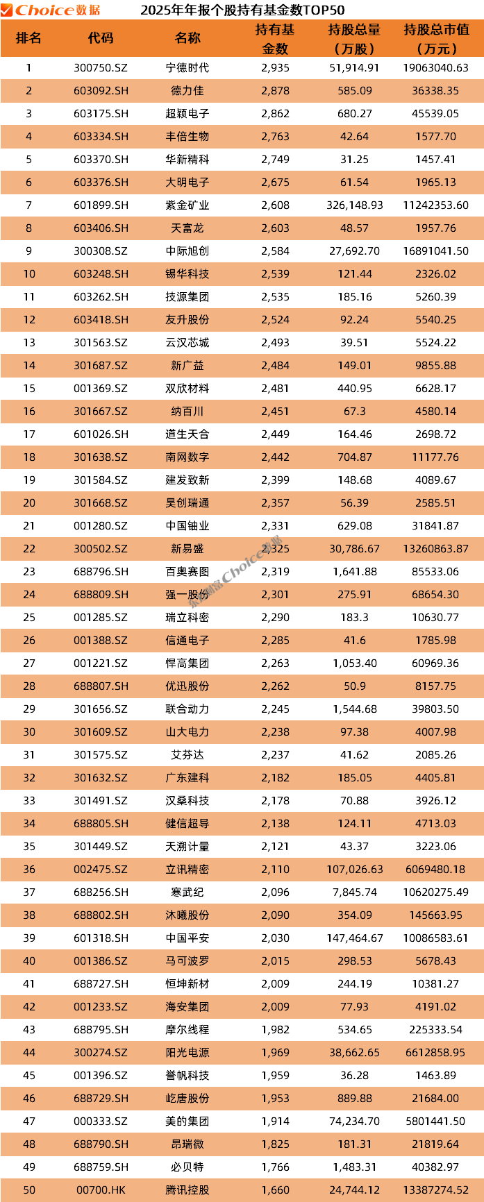 在个股持仓基金数量榜单中,宁德时代位列首位,2025年年报显示,共2935只基金持有该股;德力佳排名第二,被2878只基金持有。此外,持有超颖电子、紫金矿业、中际旭创、新易盛等40余只个股的基金数量均超过2000只。