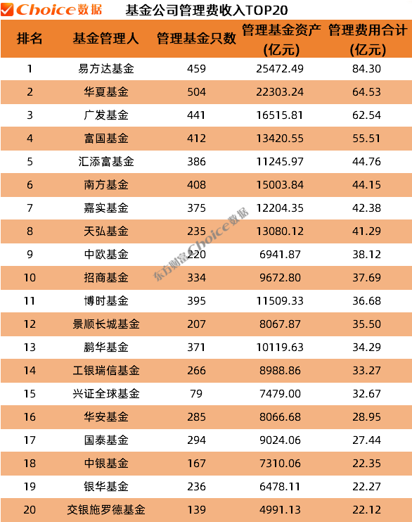 根据年报披露数据统计,大部分公募基金2025年管理费收入同比增加,易方达基金继续位居首位,管理费收入高达84.3亿元。
