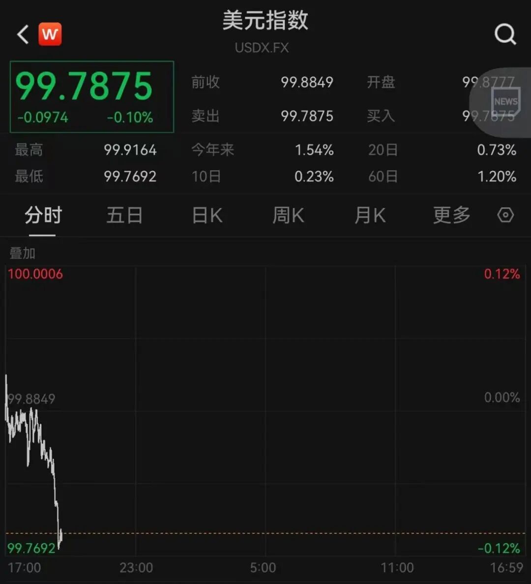 原油转跌,截至发稿,NYMEX WTI原油期货震荡走低。美元指数同样一度转跌,跌破100关口。