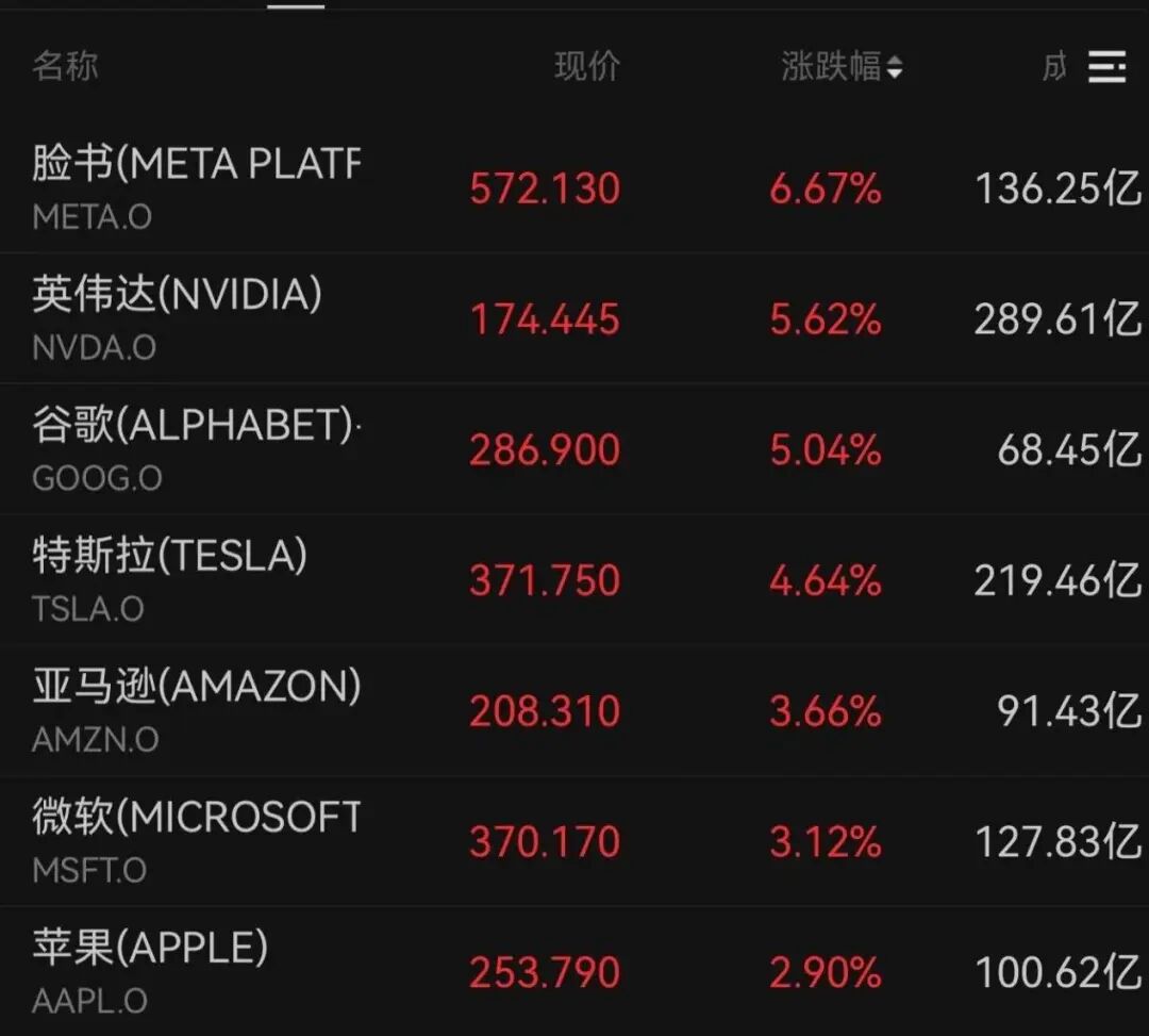 脸书上涨6.67%,英伟达上涨5.62%,谷歌上涨5.04%,特斯拉上涨4.64%,亚马逊上涨3.66%,微软上涨3.12%,苹果上涨2.90%。
