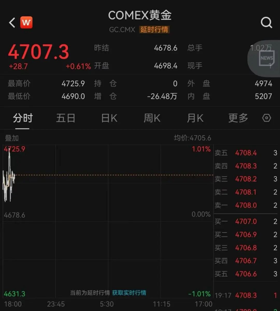 黄金反弹,截至发稿,COMEX黄金期货收复4700美元/盎司关口。