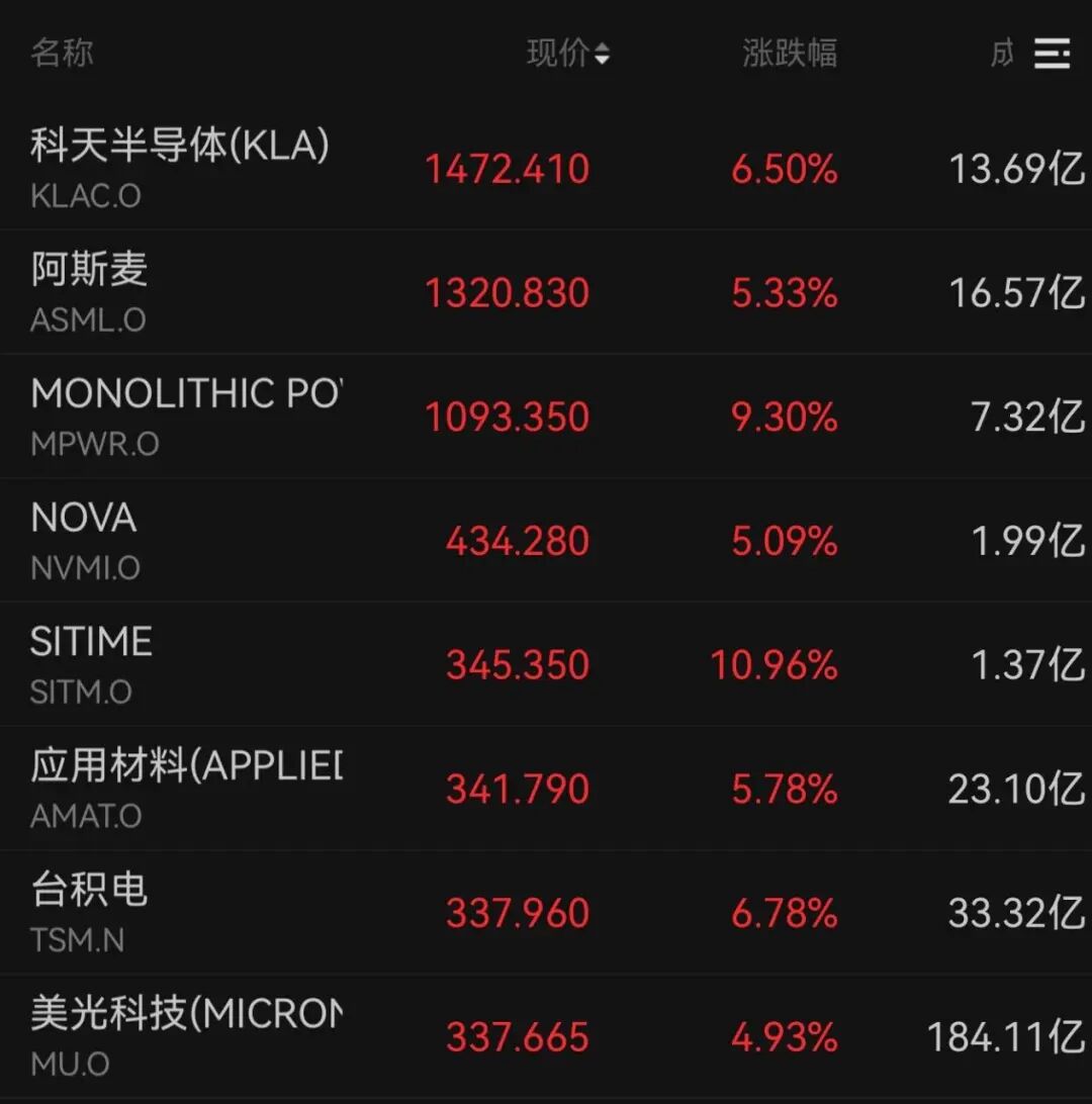 科天半导体上涨6.50%,阿斯麦上涨5.33%,台积电上涨6.78%,美光科技上涨4.93%。