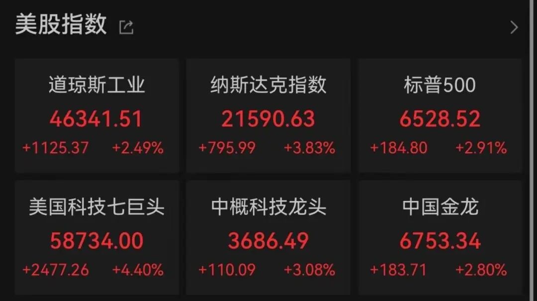 隔夜美股三大指数全线暴涨,石油、美元转跌,黄金走高。