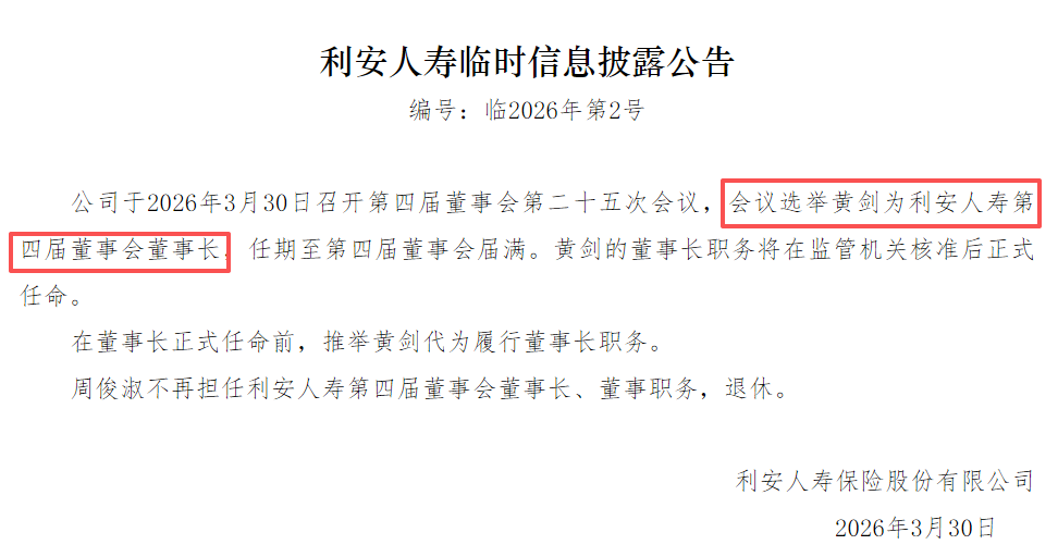 利安人寿在官网披露,3月30日,公司召开董事会,会议选举黄剑为公司第四届董事会董事长。黄剑的董事长职务将在监管机关核准后正式任命。在正式任命前,推举黄剑代为履行董事长职务。原董事长周俊淑退休。