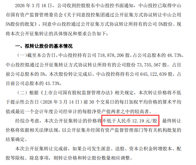 公告显示,经综合考虑,本次公开征集转让的价格将不低于人民币12.19元/股。