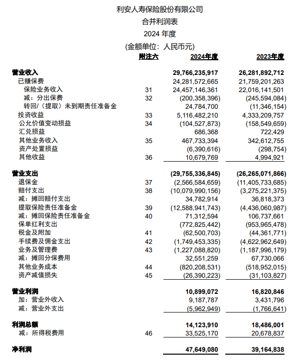 根据利安人寿披露的年报数据,2023年、2024年,利安人寿分别实现营业收入262.82亿元、297.66亿元,净利润3916.48万元、4764.91万元。