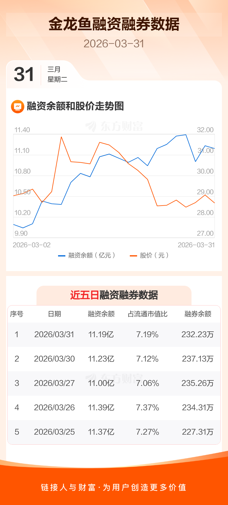 交易所最新数据显示,金龙鱼于2026年3月31日获融资买入3148.05万元,融资偿还3521.41万元,当日融资净偿还373.36万元。目前,该股融资余额11.19亿,占流通市值比例为7.19%。
