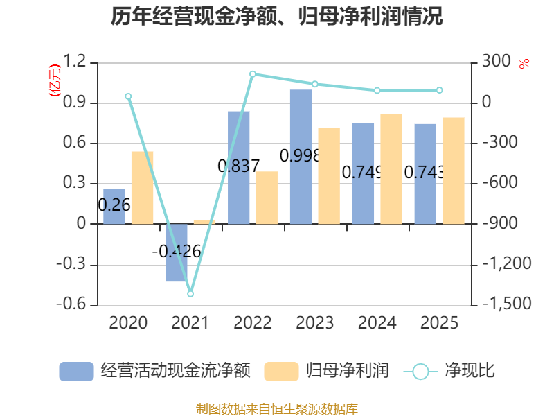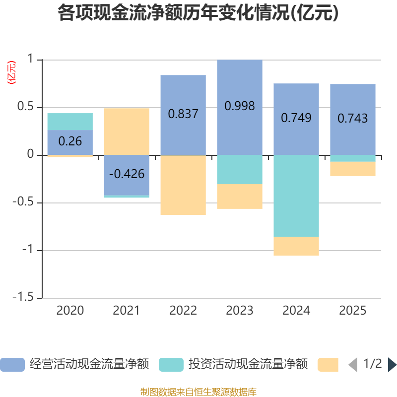 截至2025年,公司经营活动现金流净额为7428.71万元,同比下降0.77%;筹资活动现金流净额-1509.67万元,同比增加456.88万元;投资活动现金流净额-718.47万元,上年同期为-8606.89万元。