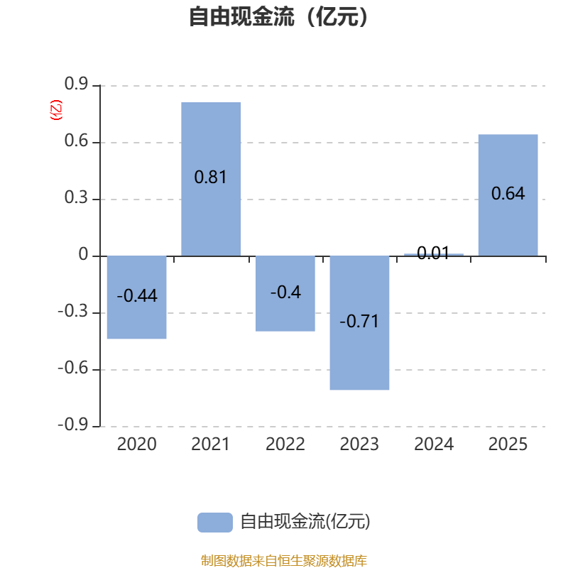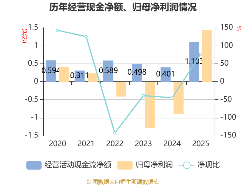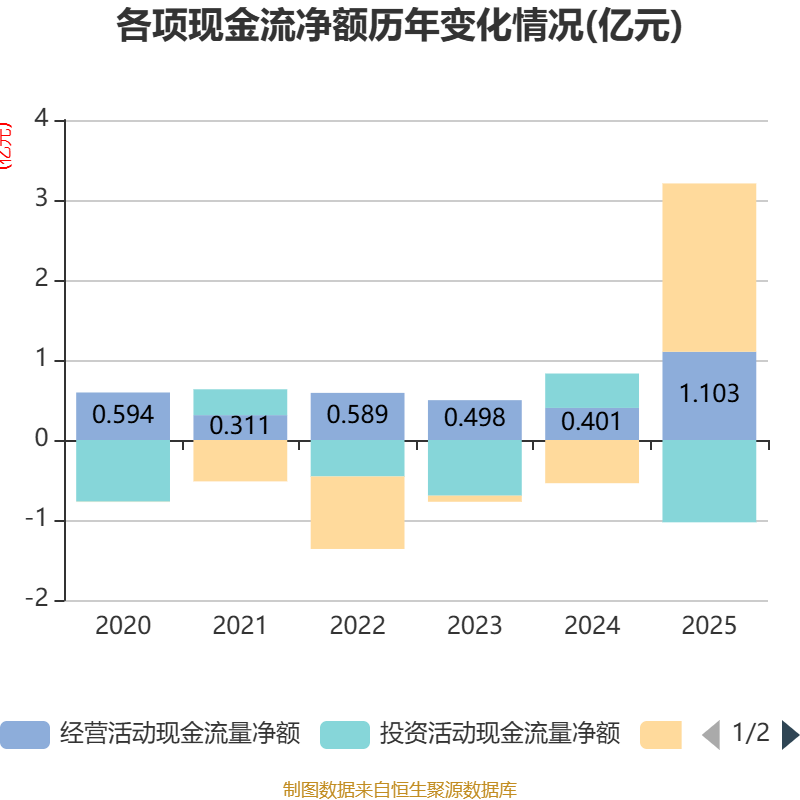 截至2025年,公司经营活动现金流净额为1.1亿元,同比增长175.23%;筹资活动现金流净额2.1亿元,同比增加2.64亿元;投资活动现金流净额-1.03亿元,上年同期为4300.57万元。
