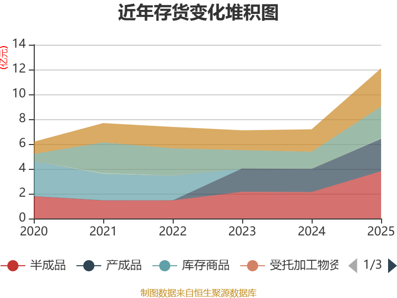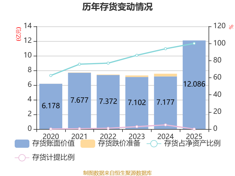 从存货变动来看,截至2025年末,公司存货账面价值为12.09亿元,占净资产的100.13%,较上年末增加4.91亿元。其中,存货跌价准备为24.35万元,计提比例为0.02%。