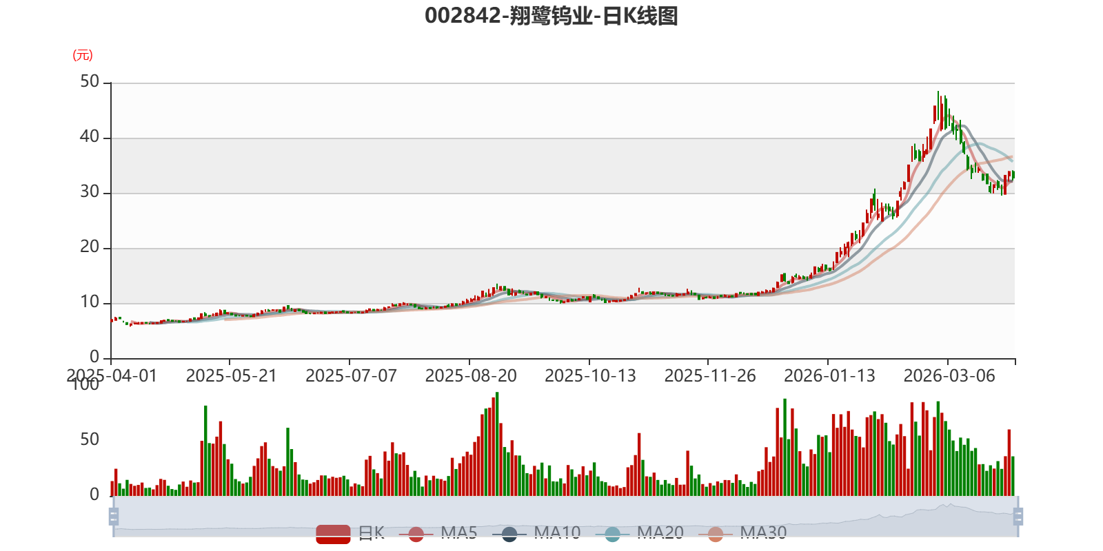 中证智能财讯翔鹭钨业(002842)4月1日披露2025年年度报告。2025年,公司实现营业总收入24.09亿元,同比增长37.71%;归母净利润1.44亿元,同比扭亏;扣非净利润1.35亿元,同比扭亏;经营活动产生的现金流量净额为1.1亿元,同比增长175.23%;报告期内,翔鹭钨业基本每股收益为0.46元,加权平均净资产收益率为13.66%。公司2025年度分配预案为:拟向全体股东每10股派现1.38元(含税)。