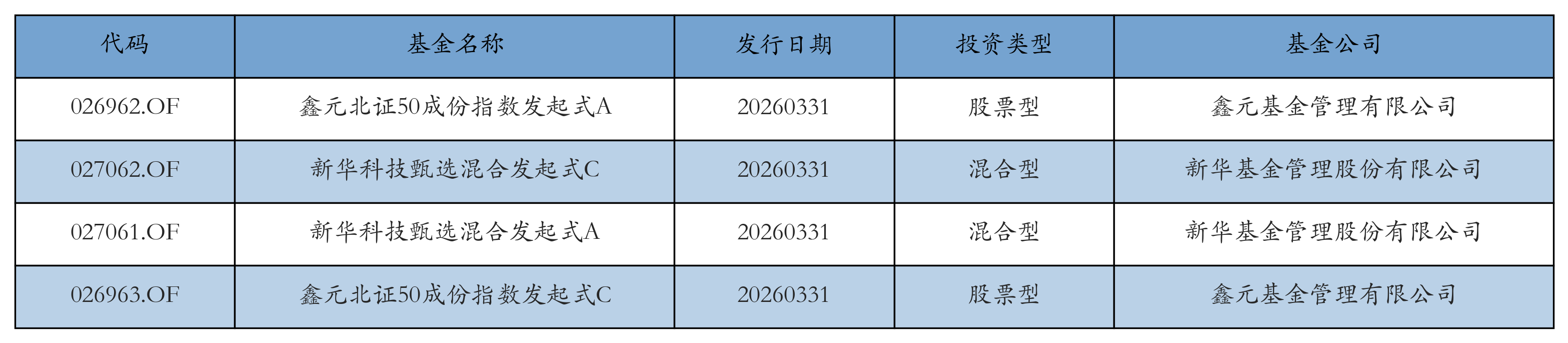 昨日有4只新基金发行,分别为:鑫元北证50成份指数发起式A、新华科技甄选混合发起式C、新华科技甄选混合发起式A、鑫元北证50成份指数发起式C,详情见下表: