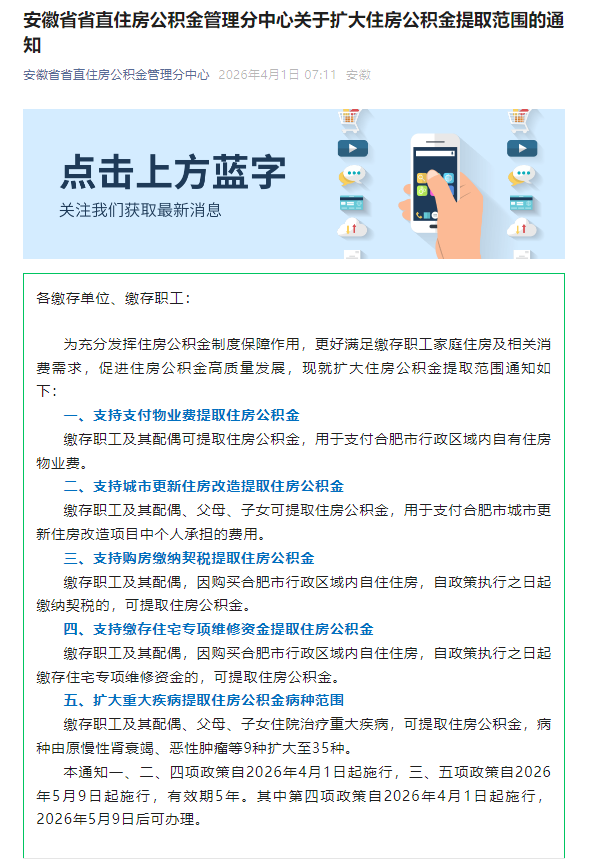 上证报中国证券网讯安徽省省直住房公积金管理分中心4月1日发布通知,扩大住房公积金提取范围。具体如下: