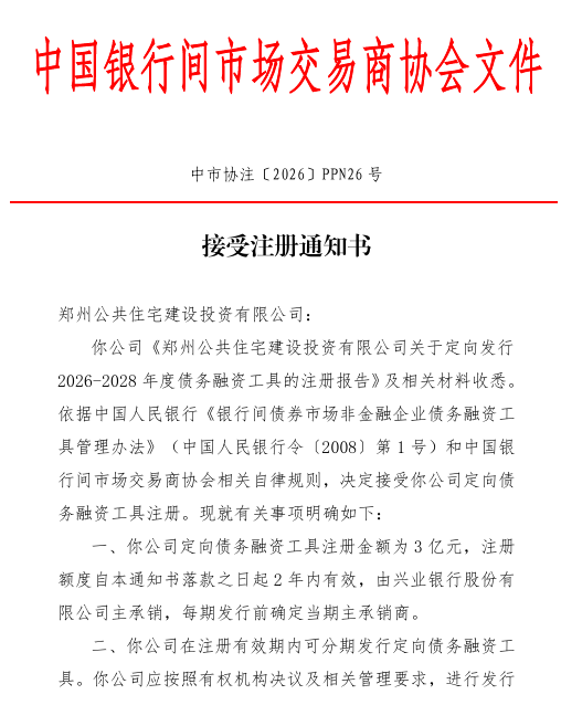 郑州公共住宅建设投资有限公司获批注册3亿元定向债务融资工具,注册额度自1月23日起2年内有效,由兴业银行主承销,每期发行前确定当期主承销商。