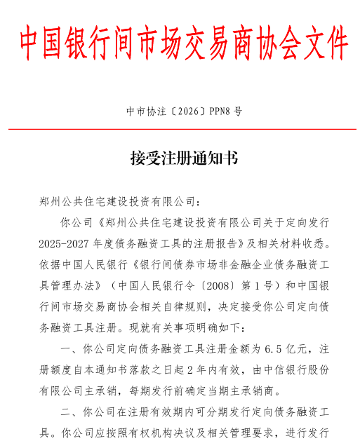 其中,郑州公共住宅建设投资有限公司获批注册6.5亿元定向债务融资工具,注册额度自1月15日起2年内有效,由中信银行主承销,每期发行前确定当期主承销商。