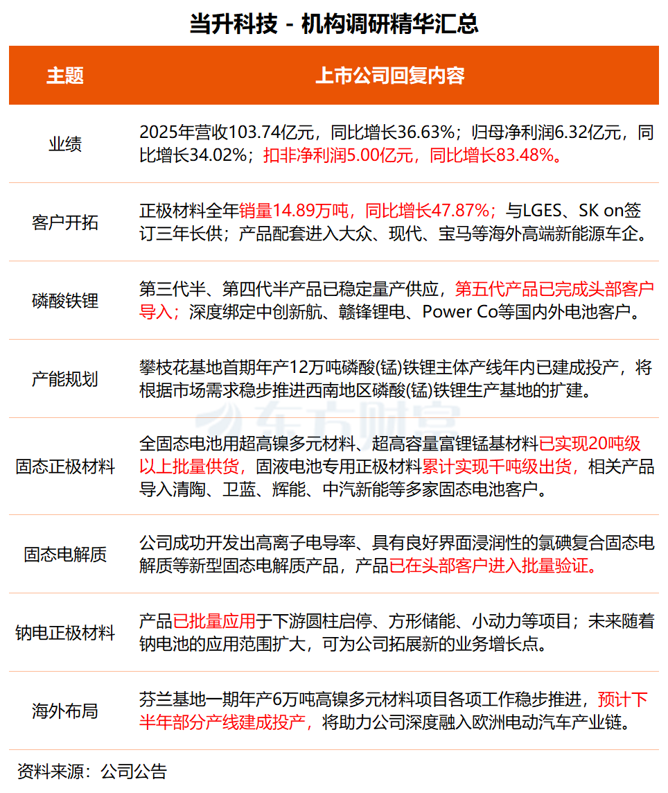 在调研中,当升科技透露,目前,公司全固态电池用超高镍多元材料和超高容量富锂锰基材料已实现20吨级以上批量供货,固液电池专用中镍、高镍、镍锰酸锂、LFP等正极材料累计实现千吨级出货,相关产品导入清陶、卫蓝、辉能、赣锋锂电、中汽新能等多家固态电池客户。