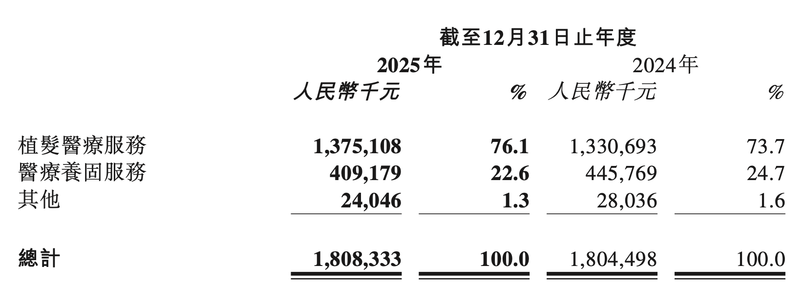 作为中国最大的连锁毛发医疗集团,雍禾医疗以植发业务为核心,2025年植发业务收入13.75亿元,占公司总收入的76.1%。