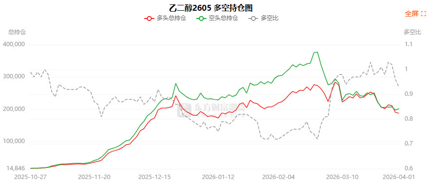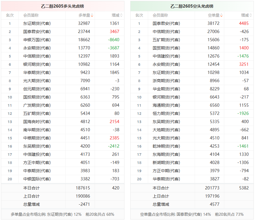 总体而言,乙二醇2605合约今日增仓下行,多空持仓排名前20席中,多方呈退场态势,空方呈进场态势。