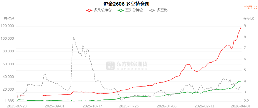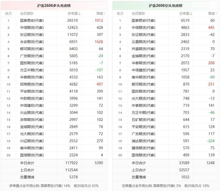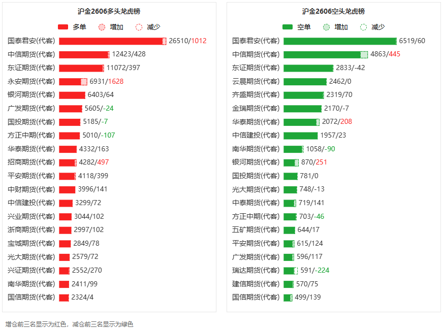 总体而言,沪金2606合约今日增仓上行,多空持仓排名前20席中,多空双方均呈进场态势,多头进场意愿强于空头。